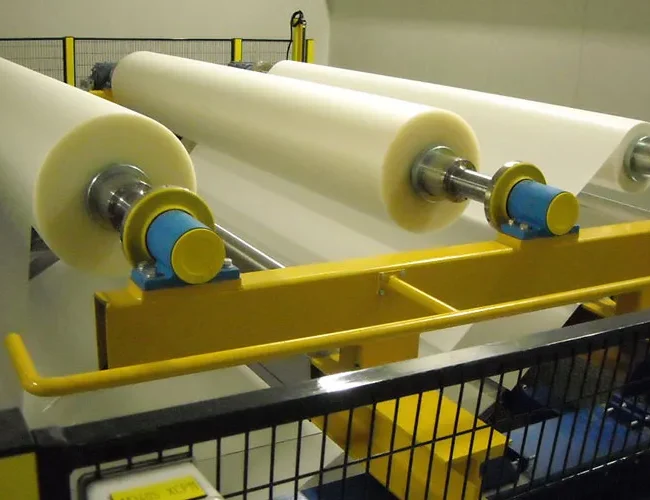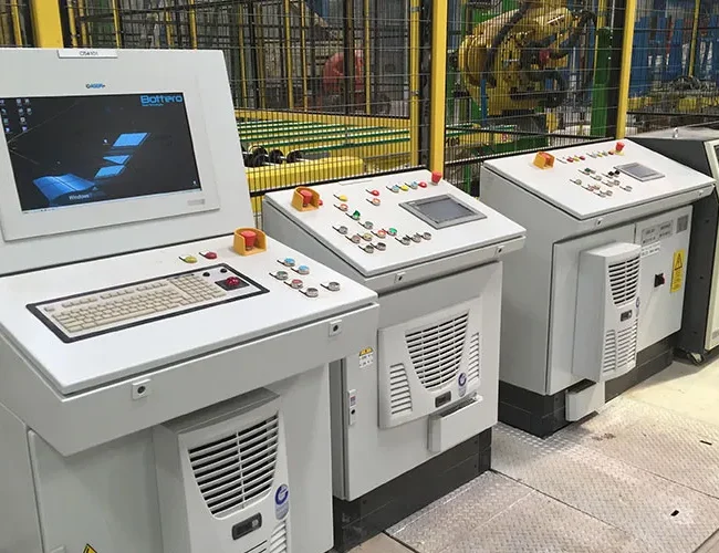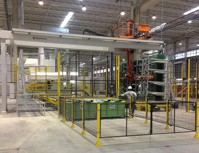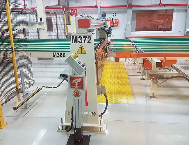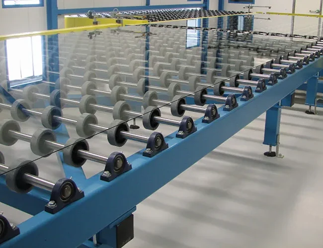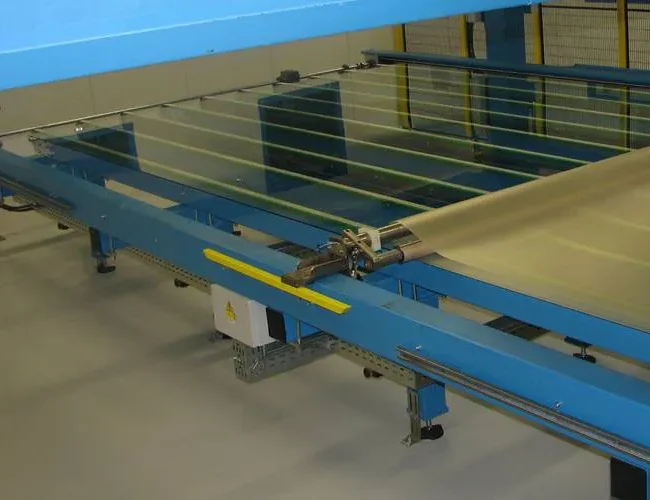 Processing lines to produce laminated glass plates. Laminated glass is used in IG unit and in other architectural applications for its safety features. This product is the result of two or more plates assembled with plastic foil (PVB) between them. After autoclave process, the glass is processed on inspection lines and stacked on final racks.