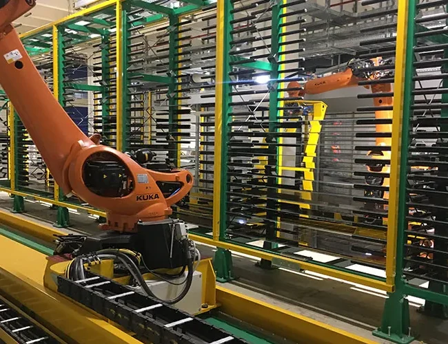 Glasses composing the module are loaded onto the line thanks to anthropomorphic robots and washed by special washing units.
